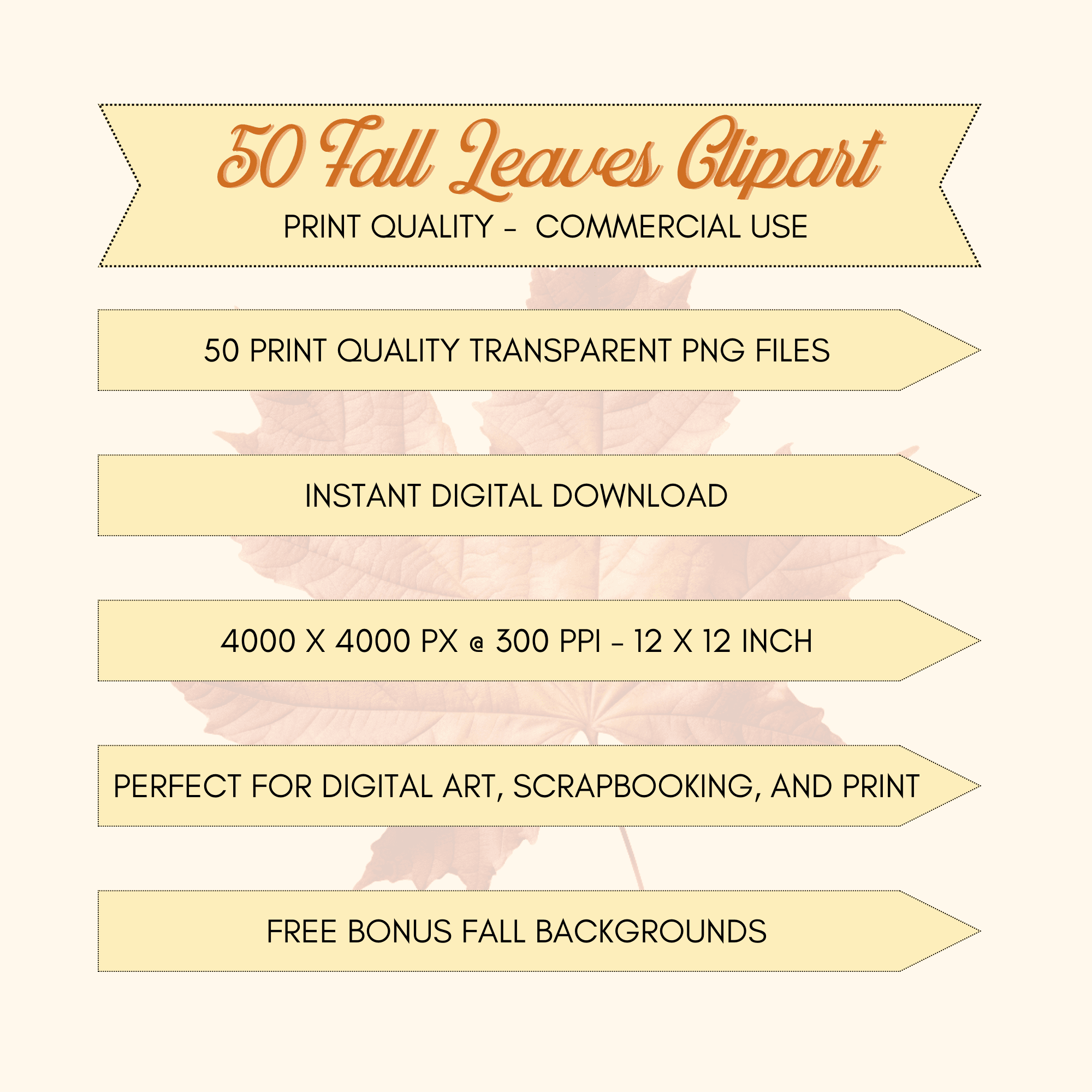 50 Fall Leaves Clipart, Fall Leaves Clip Art, 50 Print quality transparent PNG files, digital download, 12 x 12 inches @ 300 ppi, digital art, free bonus Fall backgrounds, OSullivan Supply Co, OSCO